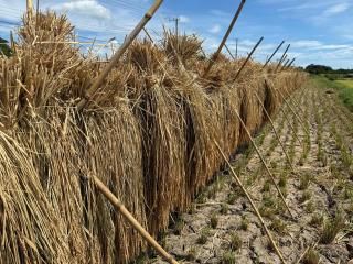 現在、乾燥機で乾燥するお米が主流ですが、こちらの天籠米は手刈り作業ではざ掛けといって、